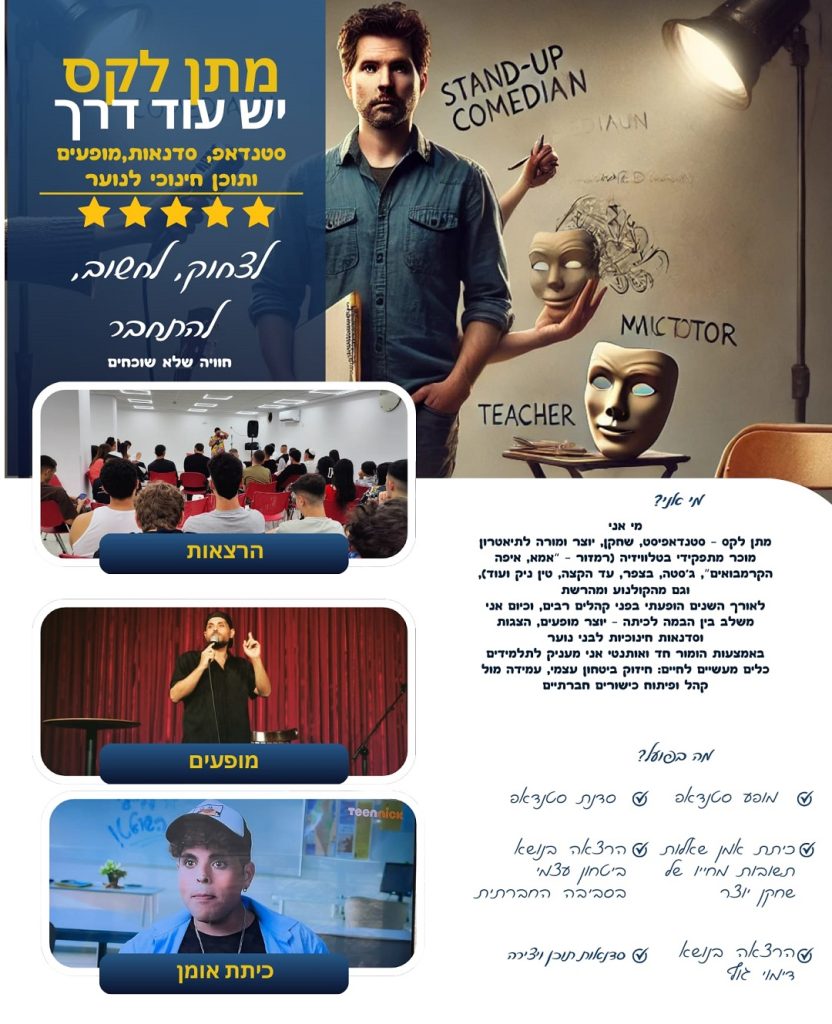 הרצאה בנושא הומור כשיטה | סדנאות כתיבה | סטנד-אפ | יצירה בימתית | הרצאות לנוער